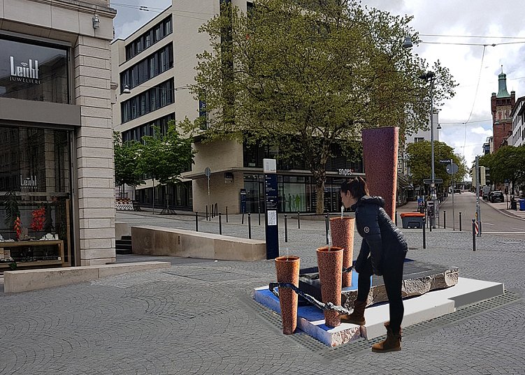 Die Arbeit ruft die Erinnerung an einen Brunnen, der einst an dieser Stelle stand, hervor.