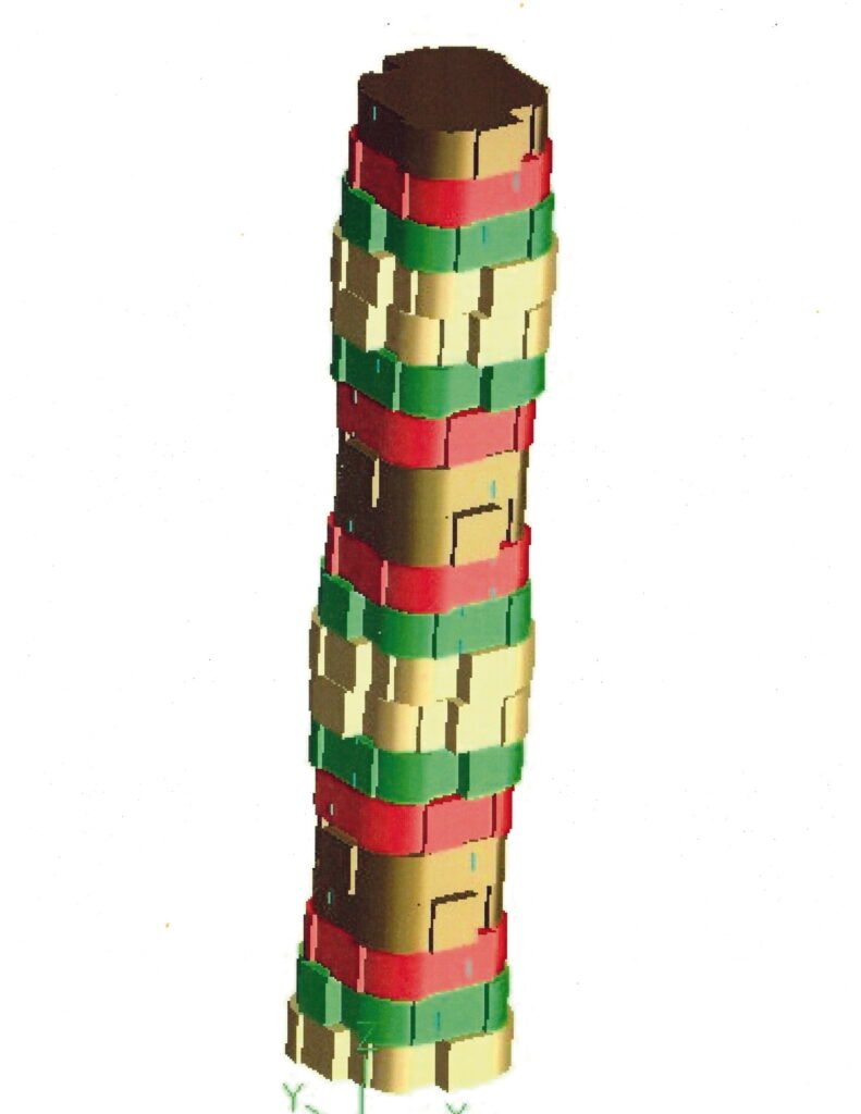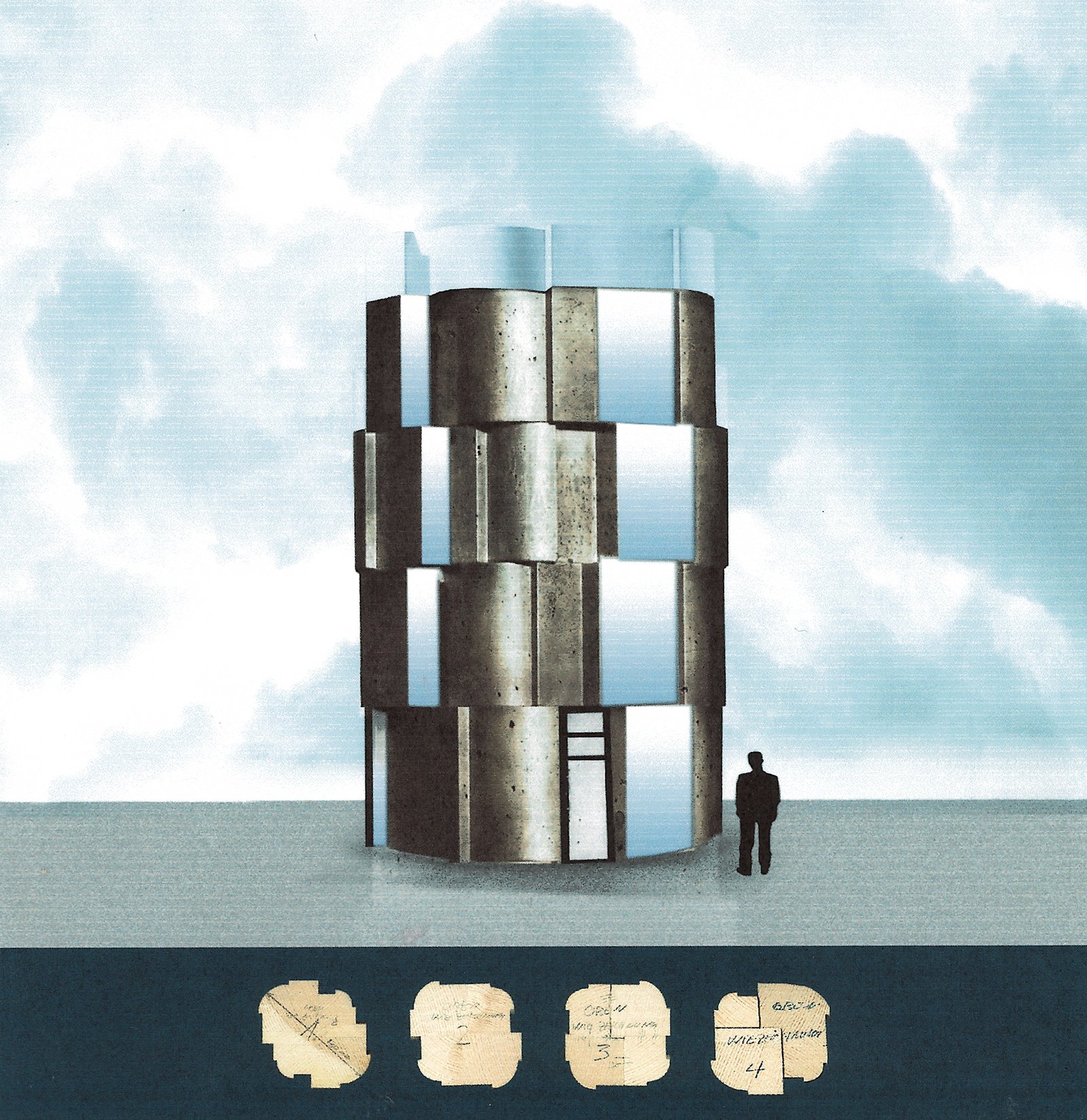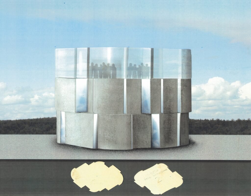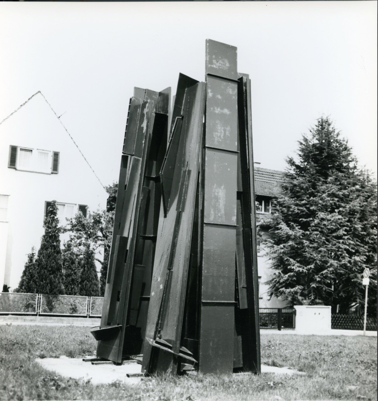 „Zwei übereinanderliegende Ringe mit ungleichen Enden. Ein Ringende -dreht- um 90°. So ergeben sich acht räumliche Konturen, die sich im Raum bewegen. Eine einfache, komplexe Gestaltung.“