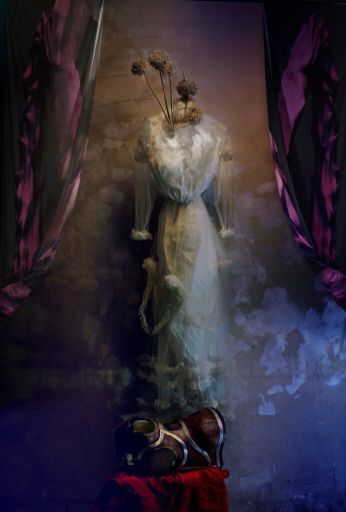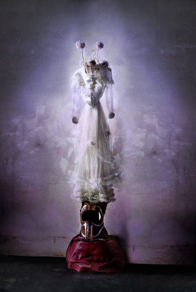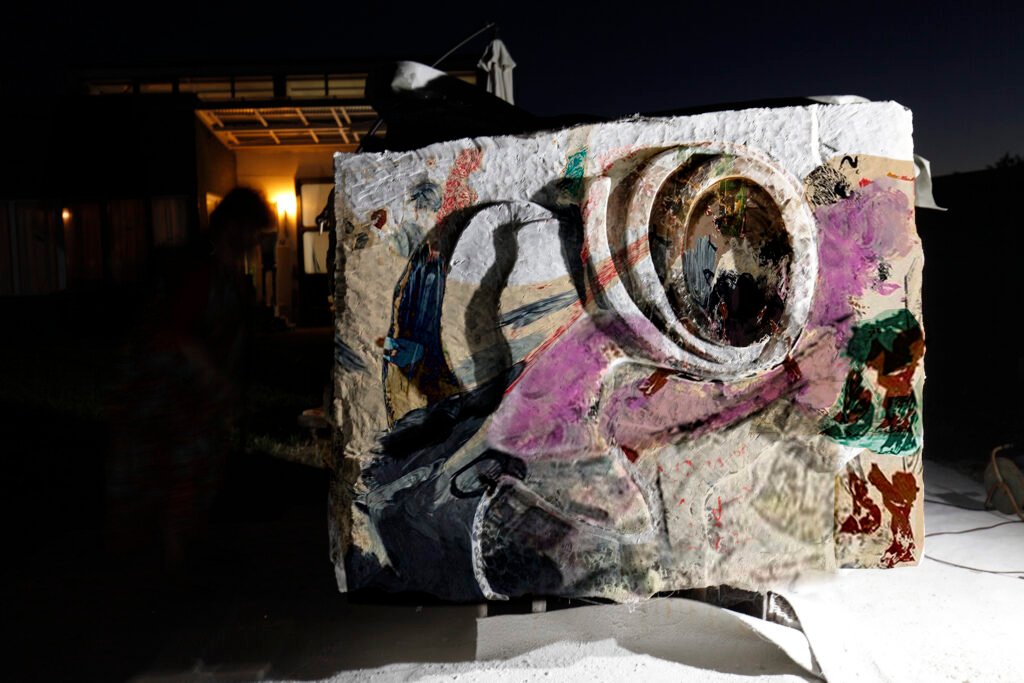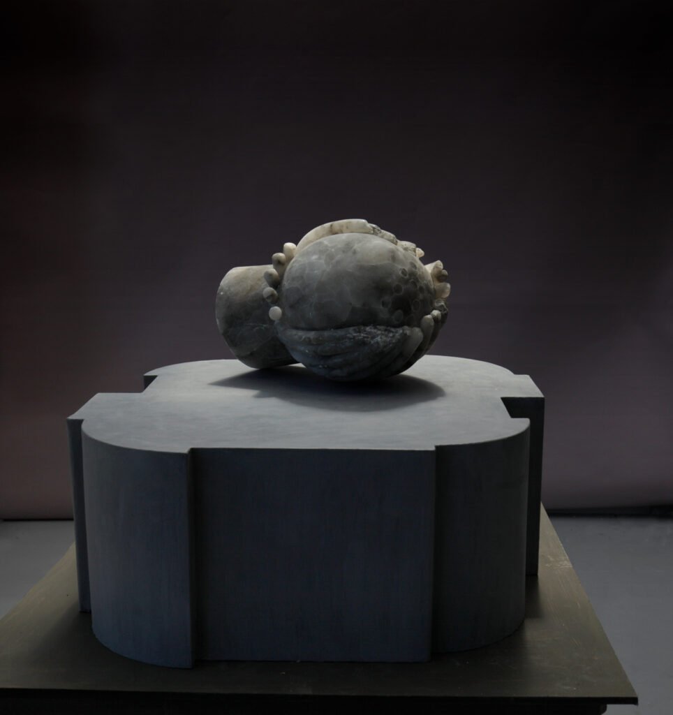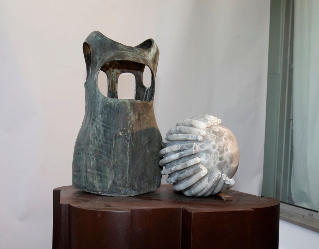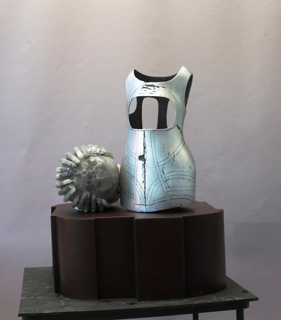 Die Steinskulpturen beziehen sich auf die in den 1930er, 40er Jahren üblichen Trockenhauben und verweisen auf Frida Kahlo’s bekannte Koketterie. Sie hat ja, wenn ich das freundlicherweise sagen darf sich unendlich oft fotografisch portraitieren lassen. Das malerische Werk besteht natürlich aus der Dramatik ihrer physischen Existenz. Die Torsoskulptur ist eine Interpretation eines Korsettes, ein ähnliches wie sie es getragen hat. Auf dem Korsett sind Markierungen von Bandagen zu sehen.