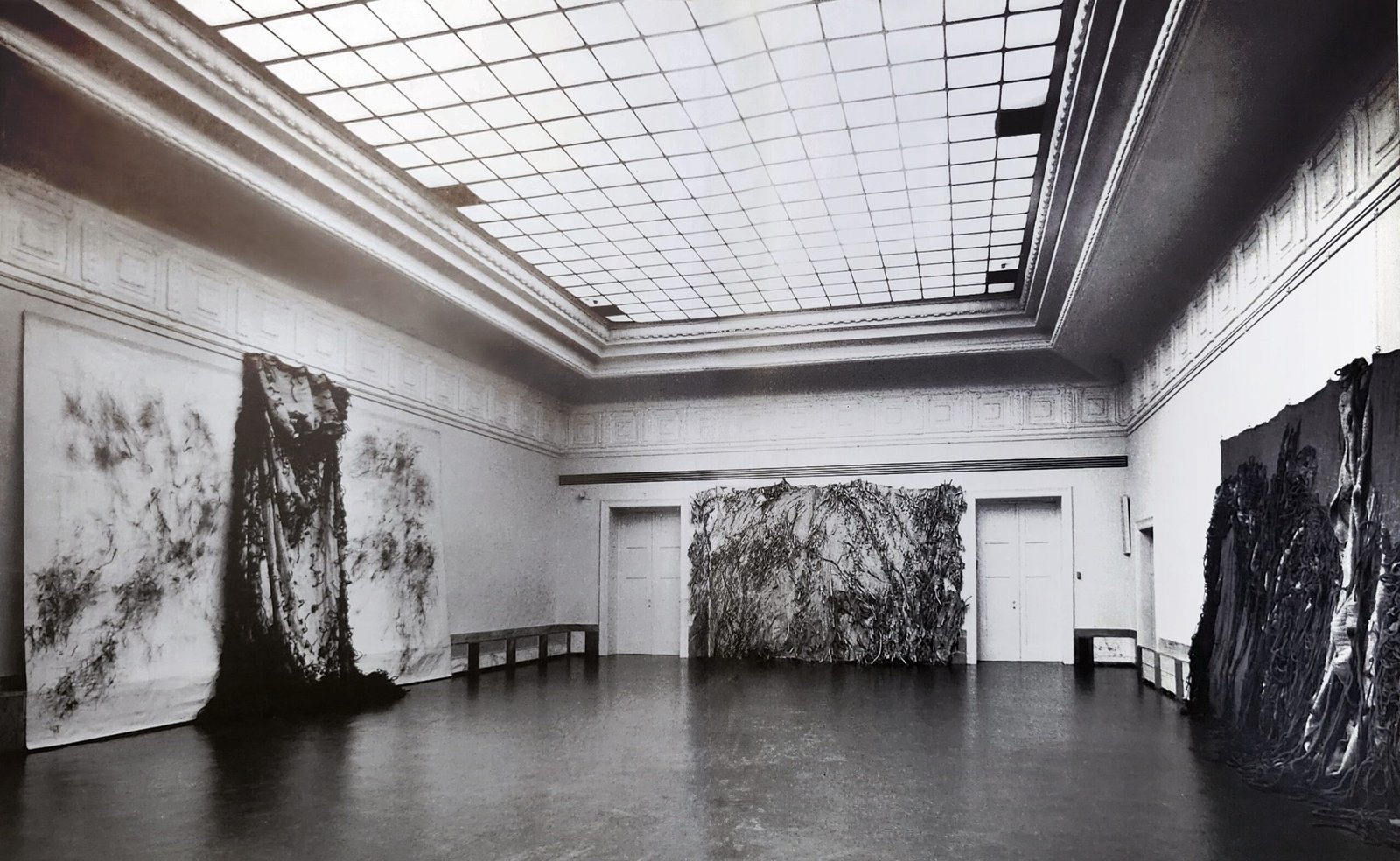„Aufbruch Textil“ (Titel der Ausstellung), 2016, Pforzheim Galerie, Kollmar & Jourdan-Haus, Ausstellungsansicht. Rotes Textil-Relief von Ritzi und Peter Jacobi.